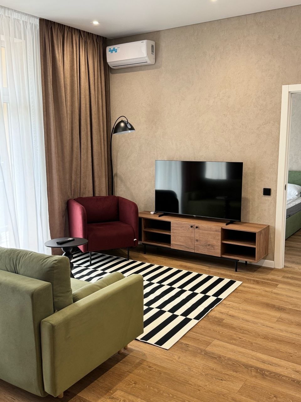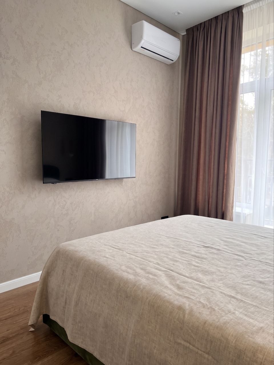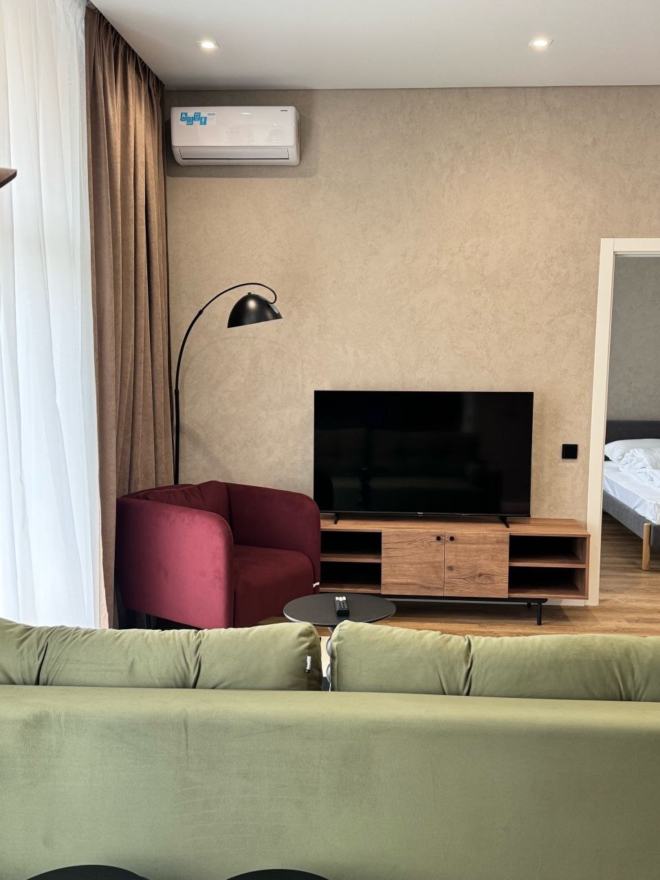 В гостиной диван, телевизор, кондиционер. В спальне двуспальная кровать и кровать полутороспальная, телевизор, кондиционер.