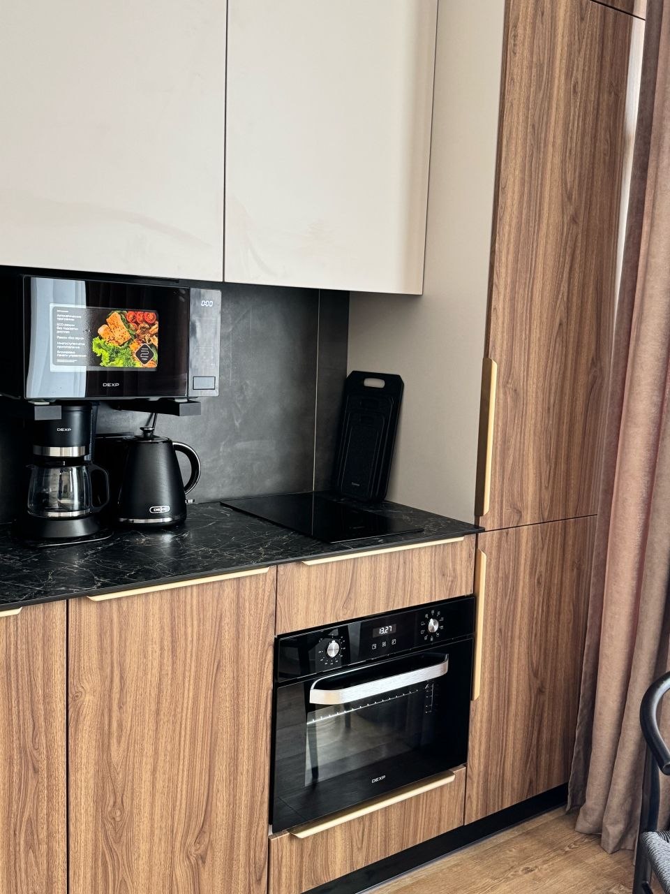 Кухонная зона оборудована всей техникой: варочная панель. холодильник, посудомоечная машина, чайник, вытяжка. микроволновая печь.